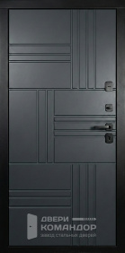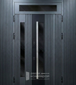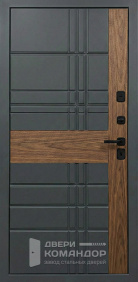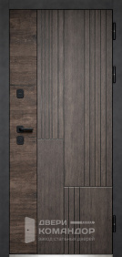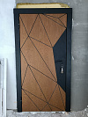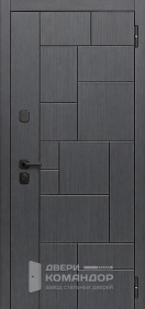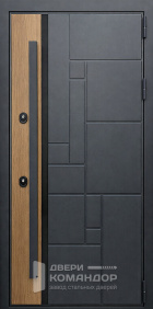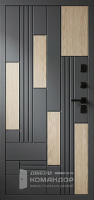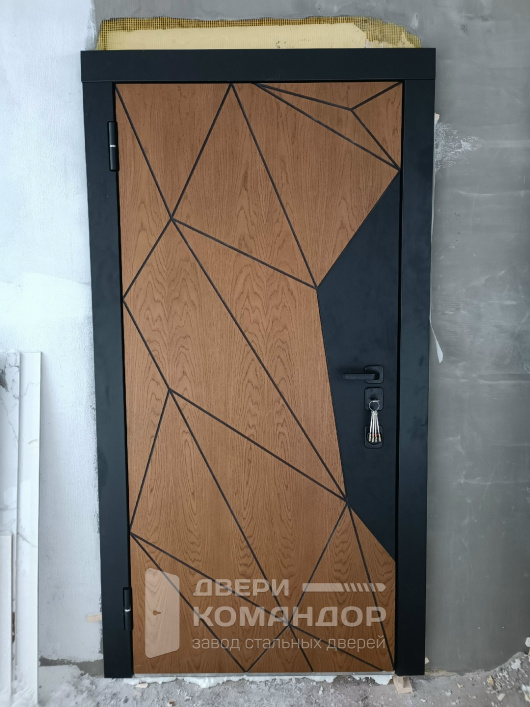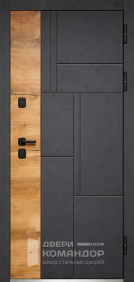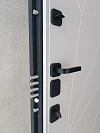 Композит Термо — тёплая дверь для частного дома и уличной установки под навесом. Снаружи — выразительная композиция: тёмно-графитовая полоса со стороны замков и тёплый оттенок дуба с диагональной фрезеровкой, рисунок ловит свет и делает вход современным; внутри — спокойный матовый белый с тем же геометрическим узором для светлого интерьера прихожей. Терморазрыв в полотне и коробе разрывает мост холода: меньше конденсата и инея зимой, стабильная температура в тамбуре. Обе стороны — МДФ с износостойким покрытием: легко моется, стойко переносит повседневные касания и долго сохраняет фактуру. Два разнесённых замка работают мягко, изнутри — удобный поворотник; по кромке видны мощные ригели и противосъёмный штырь, дверь закрывается плотно и тихо. Черные квадратные накладки и ручка подчёркивают графичность, а аккуратные кромки придают проёму собранный вид.
